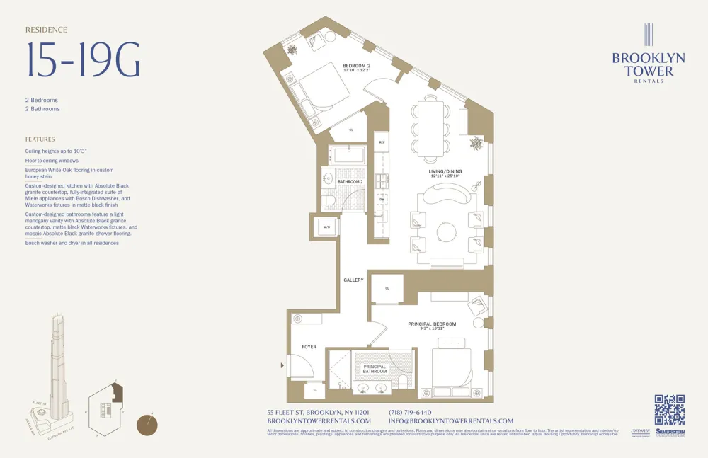 Rental residence 17G is a breathtaking 2bdrm layout featuring 10' lofty ceilings and full height windows which flank the open space offering an unparalleled eastern exposure of The Brooklyn landscape and Fort Greene Park. European white oak flooring in custom honey stain align the residence creating and indulgent warmth.