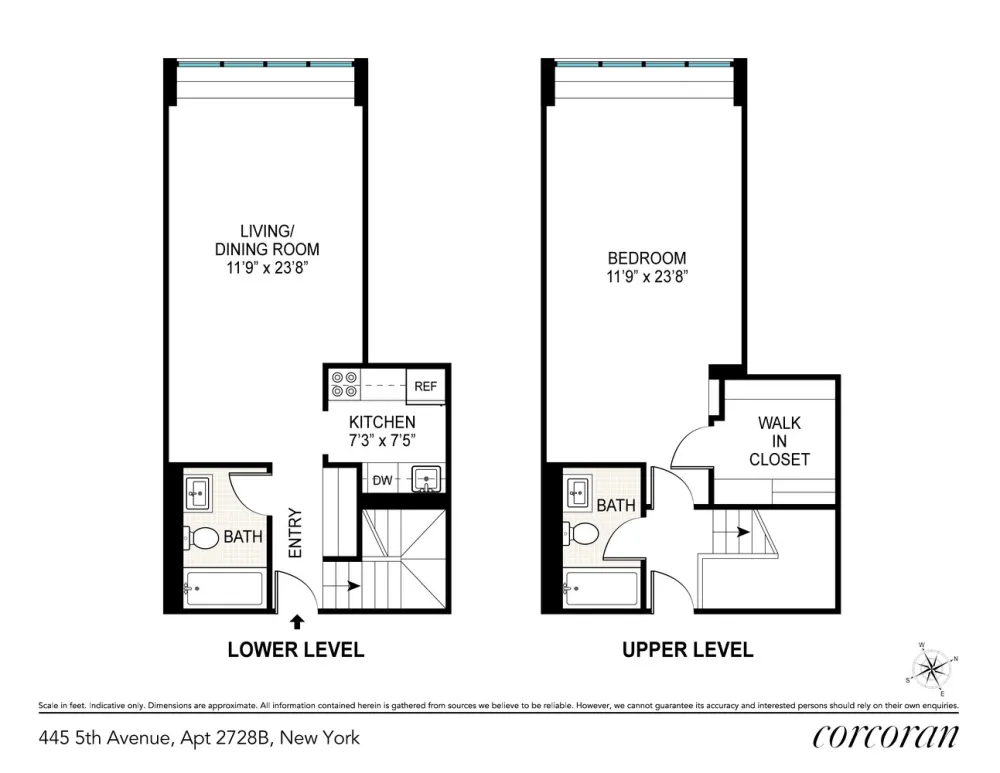 Welcome to Residence 27/28B at 445 Fifth Avenue - a rare duplex 1-bedroom, 2-bathroom home offering a thoughtfully designed living space in the heart of Midtown.This sun-splashed apartment boasts breathtaking western skyline views and spectacular sunsets through oversized windows with automated shades. Hardwood floors flow throughout, adding warmth and elegance to every room.The entry level features a spacious galley kitchen with stainless steel appliances, a 5-burner gas range, dishwasher, ample cabinetry, and generous counter space. An expansive living and dining area easily accommodates both a large sectional and dining table - perfect for entertaining or relaxing. A full bathroom and deep coat closet complete the first floor. Upstairs, the king-sized primary suite offers a tranquil retreat with space for additional seating or a home office and a second full bathroom. The cherry on top is an expansive walk-in closet rarely found in a one-bedroom home.