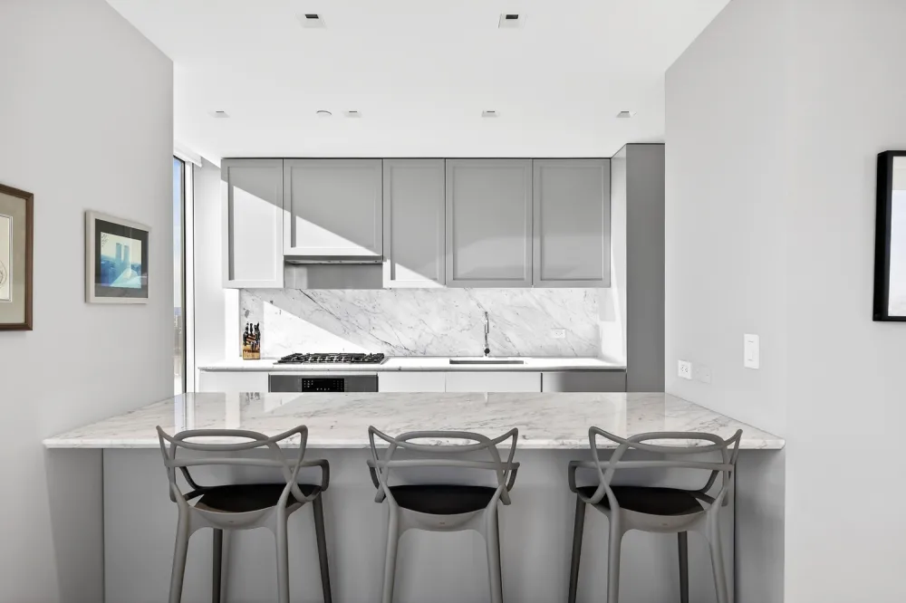 This turn-key home offers sweeping city views, both south and east, through the floor to ceiling windows. The sleek windowed kitchen was opened to the corner dining area and now offers a breakfast bar w/ seating for four, top appliances including a five-burner stove, custom cabinets, and marble countertops & backsplash.