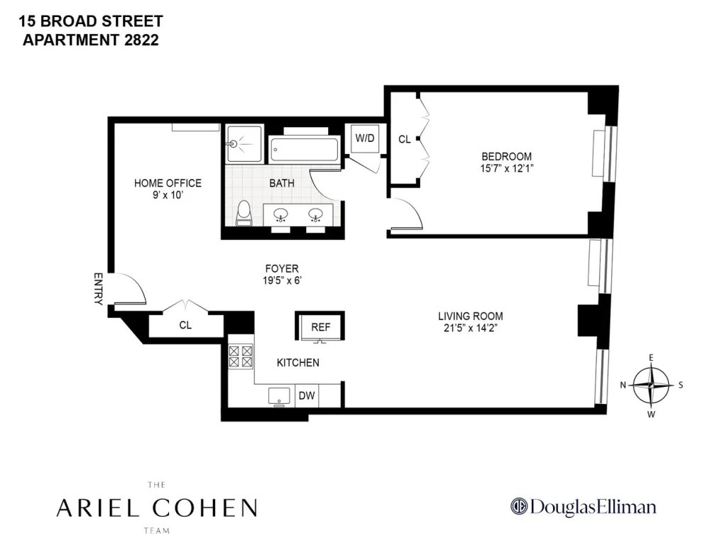 Perched high above the Financial District, Residence 2822 at 15 Broad Street is a sun-drenched 1-bedroom, 1-bathroom plus home office that offers a sophisticated blend of historic architecture and modern luxury. With soaring 11-foot ceilings and coveted southern exposures, oversized windows fill the residence with natural light and open-sky views throughout the day.
