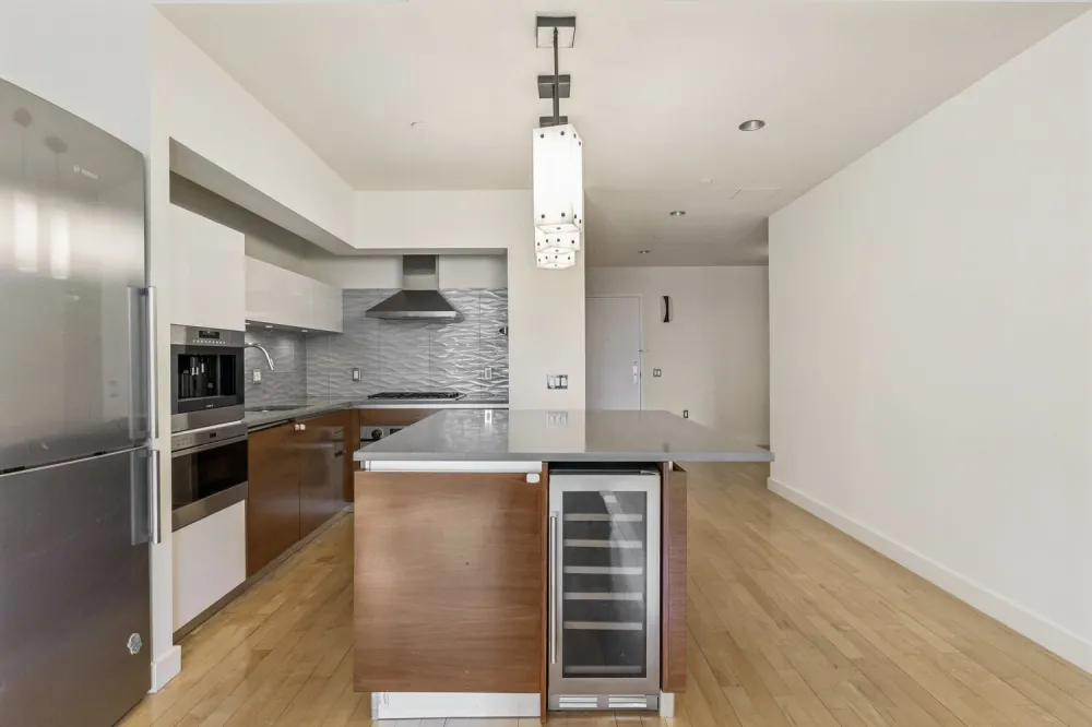 The residence offers a thoughtfully designed layout, beginning with a spacious and adaptable alcove. The generous space can remain as a home office or be customized as a bonus space tailored to your needs such as a dining room or den. The floorplan flows effortlessly into an expansive living and dining area, complete with numerous kitchen upgrades. The chef's kitchen is beautifully appointed with bespoke Hans Krug cabinetry featuring Blum hardware, custom quartz countertops, a Sub-Zero refrigerator/freezer with ice maker, built-in Wolf coffee maker and microwave, and a newly installed Avanti 28-bottle Designer Series wine chiller seamlessly integrated into the island.