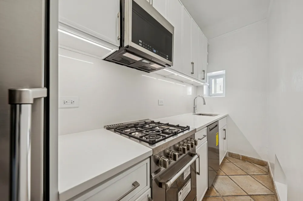 The brand-new, windowed kitchen is thoughtfully designed and outfitted with high-end European appliances by Miele and Bertazzoni, luxurious white quartz countertops with a matching backsplash, Hansgrohe fixtures, and a stainless-steel undermount sink. The bathroom is equally refined, featuring a new Kohler medicine cabinet, updated lighting, a crisp white vanity with an Italian Carrara marble countertop, and Hansgrohe fixtures.