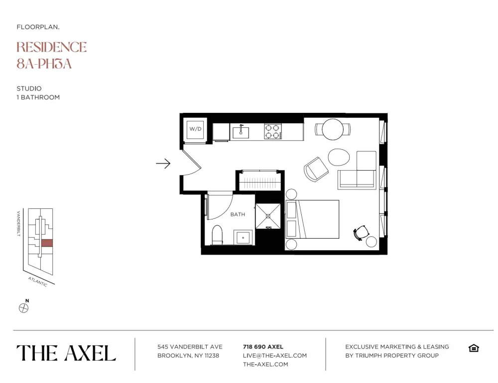 Located at 545 Vanderbilt Ave, The Axel is conveniently within walking distance of some of Brooklyn’s landmarks including the Brooklyn Botanical Garden, Grand Army Plaza, Prospect Park, and Barclays Center. Transportation in the city is a breeze as The Axel is nested near over ten MTA train lines and the Long Island Rail Road.