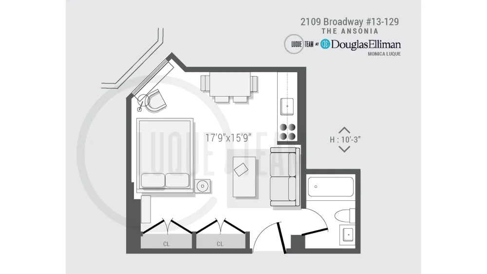 Imagine living in a bright, beautifully updated studio at the Ansonia Condo, featuring soaring 10'-3" ceilings, large corner windows that flood the space with light, and plenty of custom closets for all your storage needs. The kitchen is thoughtfully laid out with ample cabinets and counter space, making cooking a joy. The open floor plan offers flexibility, so you can arrange your furnishings just the way you like.