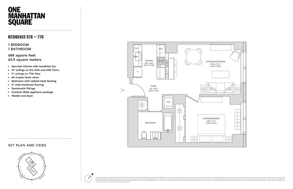 A rare opportunity to own one of the highest one-bedroom currently available at One Manhattan Square with open, unobstructed views.