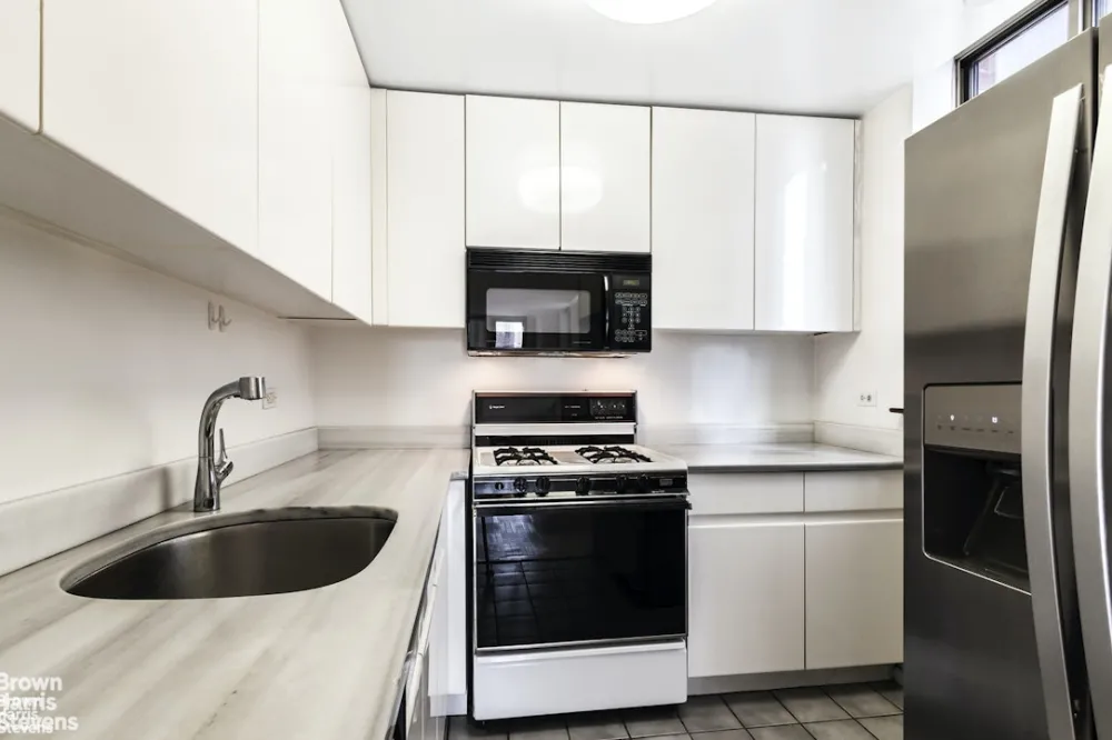 The spacious apartment offers an updated, windowed kitchen with marble countertops, a dishwasher, and a French-door refrigerator. The generous living and dining area is filled with natural light and showcases open skyline views through new oversized windows. The bedroom easily accommodates a king-size bed and the apartment offers excellent closet space throughout.