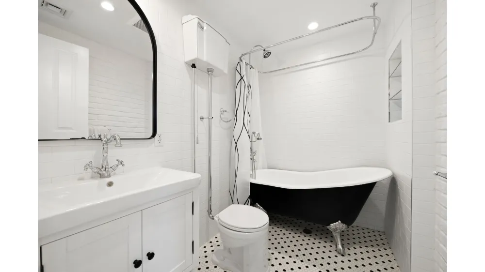 This unit has exposed brick throughout with an open kitchen, white shaker cabinets, stainless steel appliances with a dishwasher. Both bathrooms are modern with a Victorian design, vintage claw foot cast iron soaking tub, radiant heated flooring. Hardwood floors throughout the unit and central air/heating with a smart Nest thermostat. There is an in unit washer dryer.